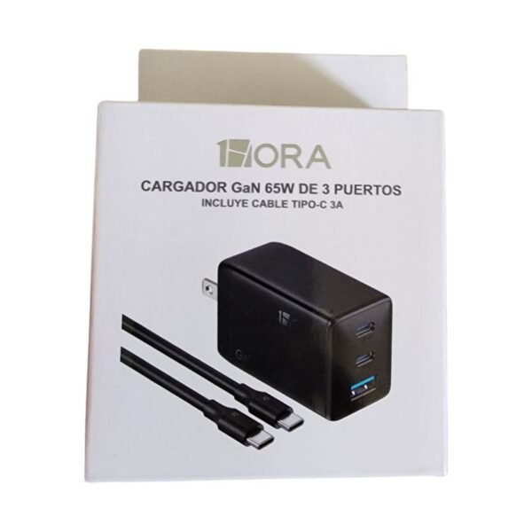Este es un cargador Marca 1hora de carga super rápida 65w de potencia, incluye 2 puertos tipo C, un puerto usb, y un cable de carga super rápida tipo C, 3a , cuenta con 15 días de garantía por cualquier desperfecto de fabrica.