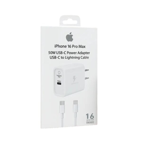 Este es un cargador Marca Apple de carga super rápida 50w de potencia, incluye cubo tipo C de 2 entradas y cable tipo C a Lightning, cuenta con 15 días de garantía por cualquier desperfecto de fabrica.